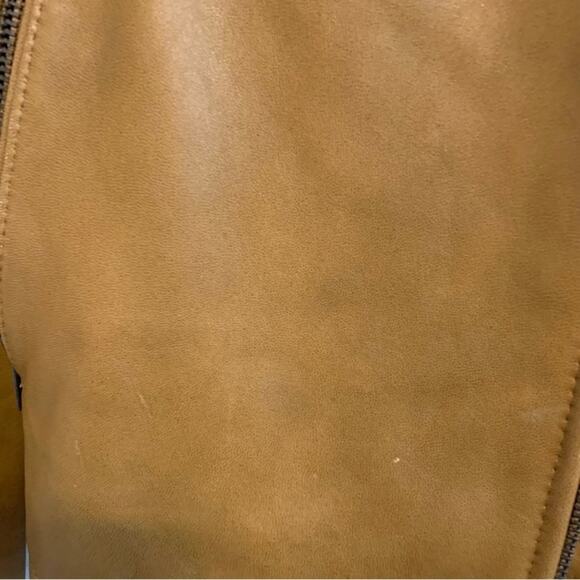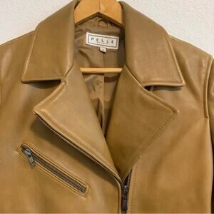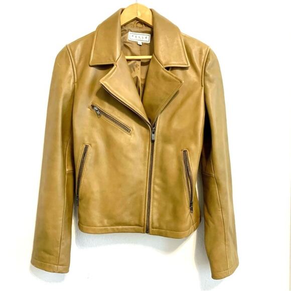 Caramel brown leather jacket by French fashion label PELLE Studio. Asymmetrical full zip and chest pocket give this jacket an edgy look. Waist length. Genuine leather. Lined. Zippers at arm cuffs.