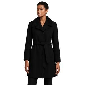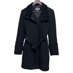 Pelle Studio Wool Blend Belted Coat Black Faux Fur Trim Sz M