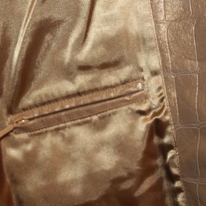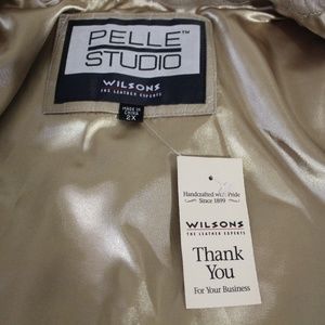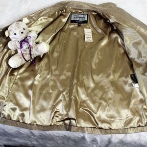 NWT, Pelle Studio Gold Croc embossed genuine leather blazer by Wilson's Leather. Size 2X. Two external slip pockets and one interior zipper pocket. Beautiful golden satin-like interior lining. Neck to hem is 29 1/2", Shoulder to shoulder is 19 1/2", Sleeves are 25 1/2", arm pit to pit is 24 1/2". Surprisingly lite. Really lovely soft "melted gold" color in person. Still has the tag, Original price $275!! (Sorry it's a bit rumpled in photos, just unpacked from moving!)