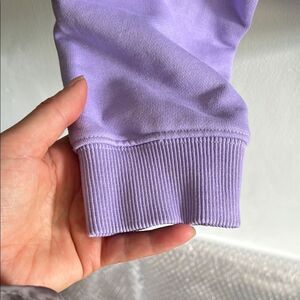 Soft lavender sweatshirt with black stripe accents. Features Peloton logo. Ideal for casual wear. Size small, perfect condition