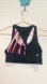 71% polyester, 29% spandex and the liner is 91% nylon and 9% elastic it is black with orange blue purple colors on the front and on the back. It has a really cool back part which has purple orange, pink and gray and purple.