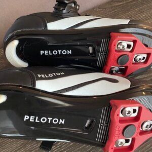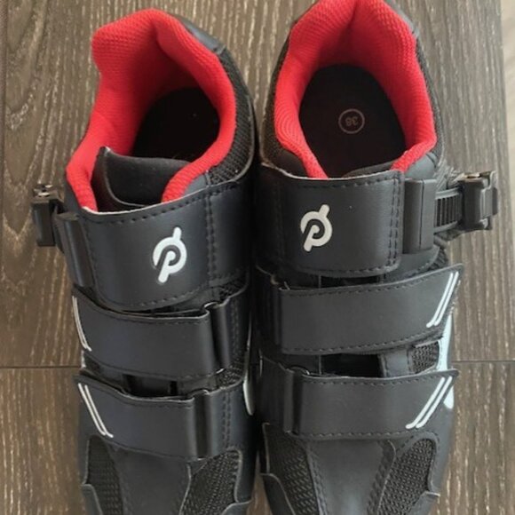 Sleek Peloton athletic shoes. Black exterior with red interior. Secure strap design. Ideal for workouts.