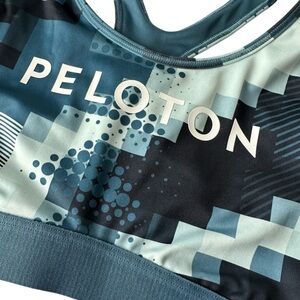 Experience the perfect blend of style and support with the Peloton Sports Bra, showcasing a vibrant blue and green mosaic pattern. Designed for comfort, this piece features wide shoulder straps and a racerback style, making it ideal for any workout. The modern digital-inspired design adds a unique touch to your activewear collection.