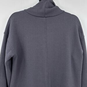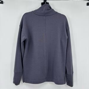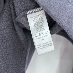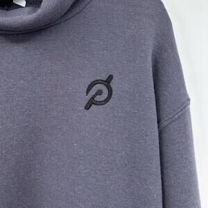 Peloton womens sweatshirt in charcoal gray. Features a relaxed mock-neck collar, subtle embroidered Peloton “P” logo at the left chest, side slits at the hem for movement, and extended cuffs with thumb-holes for added coverage and style. The back is clean with a center seam for a subtle design detail. Interiors show a warm fleece lining. Size small. Excellent used condition. No flaws detected. See measurements for proper fit.