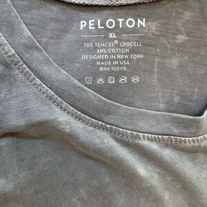 Name/Details: Peloton charcoal muscle tee with 'Together We Go Far' print. Ideal for workouts or casual outings. Soft and breathable fabric.