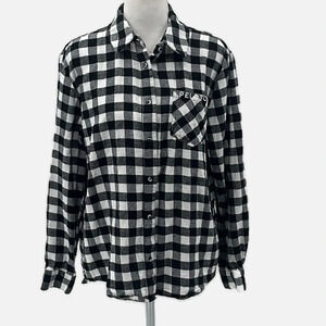 Peloton Cotton Flannel Buffalo Check Button Front Long Sleeve Shirt - Medium. Great pre-owned condition. Minor wash wear, pilling. Black and white, 100% cotton, super soft flannel, long sleeves with a double button cuff, shirttail hem. Approximate measurements: 22" pit to pit, 25" length.
