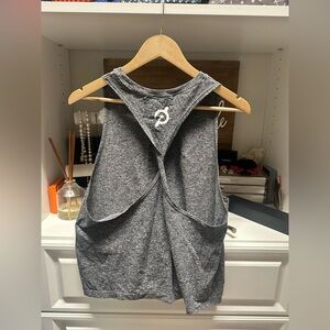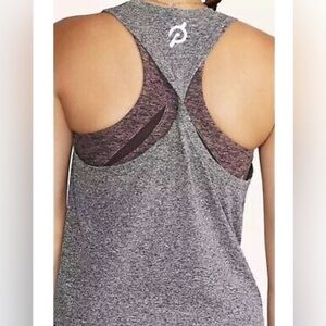 Experience ultimate comfort and style with the Peloton tank top, featuring a sleek sleeveless design and a striking backless racerback style. Crafted in a lightweight, stretchy fabric, this gray and red top is perfect for workouts, offering freedom of movement and moisture-wicking properties.