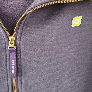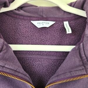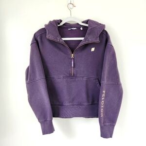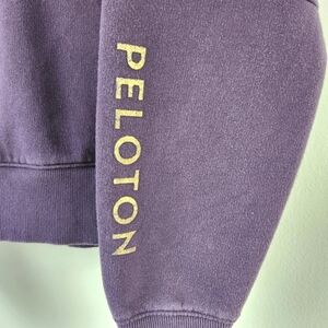 In good condition. A dark purple color. Boxy fit. Peloton logo on front with gold letter down sleeve. Front kangaroo pocket. Heavy quality. Showing signs of wear on lettering and fading. Also small stain on elbow as shown. Measures approximately 22 inches long and 21 inches pit to pit.