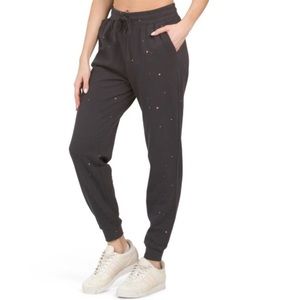 elastic waist with drawstring, ribbed trim, paint splatter detail