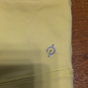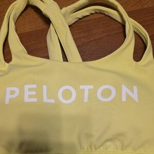 Lemon-colored sports bra with Peloton branding. Features a cross-back design.