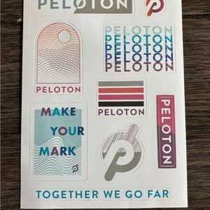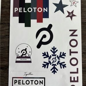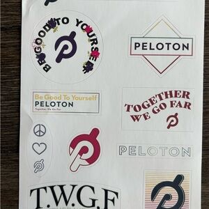 Diverse Peloton stickers with logos and symbols. Ideal for personalizing items.