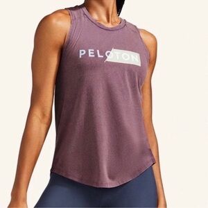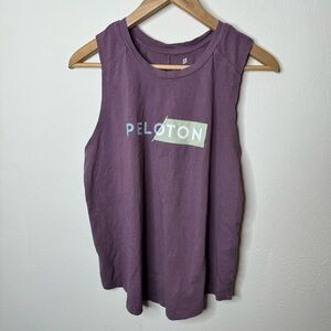 This Peloton women's tank top in a muted purple shade is made for movement, motivation, and major comfort. Size Medium. Features a modern muscle tank cut with bold Peloton graphic lettering across the chest. Soft cotton fabric with a relaxed fit makes it perfect for cycling, lifting, or lounging.