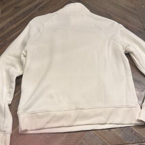 Off-white pullover featuring a pink Peloton logo on the sleeve. Stylish half-zip design.