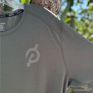 Olive tee with subtle vented stripes, quick dry. Features Peloton logo. Ideal for activewear.