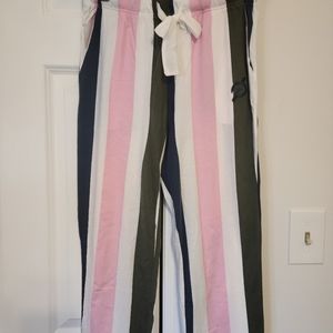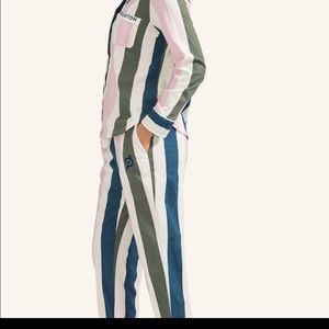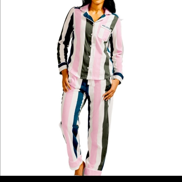 New Peloton pajama set. soft and lightweight fabric. Stripes are pink, navy, olive and white.