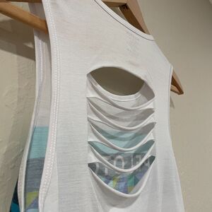 Peloton Spring Geo Slash-Back Tank, in size small / sm / S. Beautiful, stylish and colorful! Fun slashed accents across the back. shows off your cute sports bra backs/straps. Pretty green/blue/purple geometric pattern; great for summer, spring. Oversized and so comfy for your workout, just relaxing, running everyday errands, athleisure, everyday, casual,running, lifting, as PJs, or as a top over your swimsuit/coverup. Smooth, light, stretchy modal / polyester blend. Comfortable stretch for all-day wear. Women's / Unisex. Made in USA.