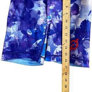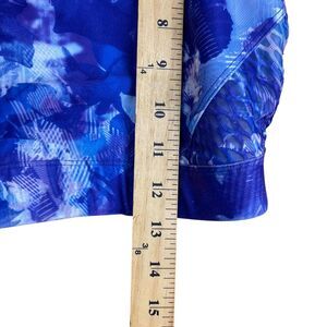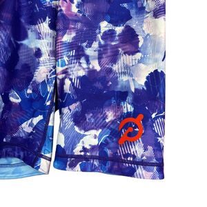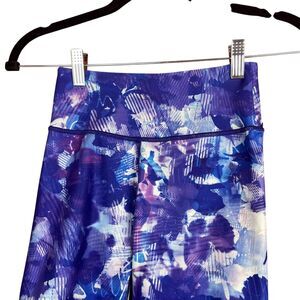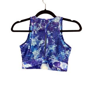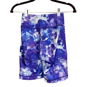 This set includes matching biker shorts and a cropped sports bra, both in a vibrant abstract blue and purple print with mesh-lined details