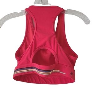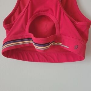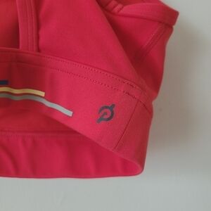 Women's red/orange high scoop neck medium impact sports bra by Peloton, size small. Sports bra has multi-colored stripe graphic along bottom band of bra with PELOTON stamp, along with signature regional logo decal on chest. Small keyhole opening in the racerback design.