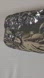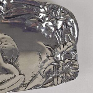 This silver aluminum tray has a trio of bunnies relaxing amongst the greenery outlining the edge of the tray. This cast piece was made in Argentina. Marked Peltrina #80-6291 on the back.