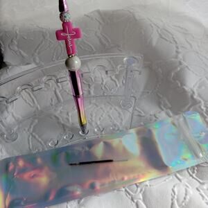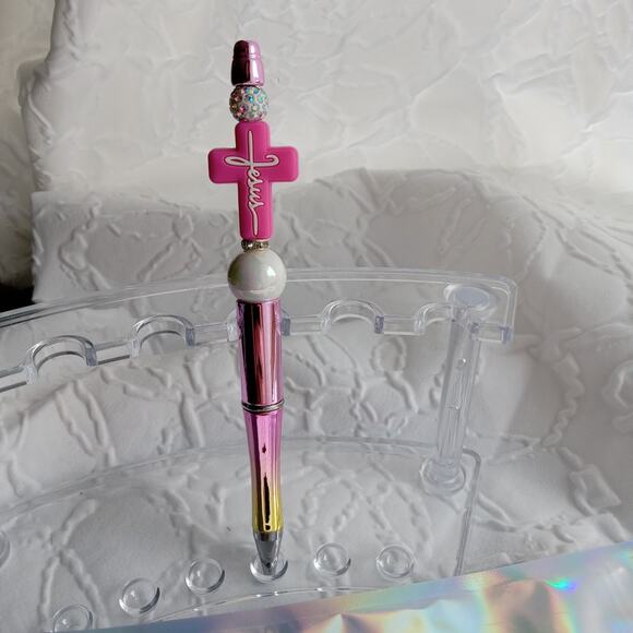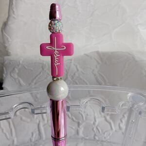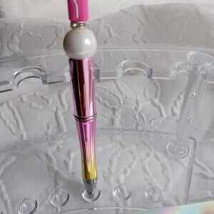 Pink pen with spinable beads. Twist pen at bottom to open or close pen. Ink is black and pen comes with additional refill. Handmade, New.