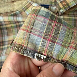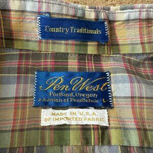 Traditional Pen West country plaid button-down shirt, size large, with short sleeves. Made in the USA, it has minor cuff damage. Perfect for casual or semi-formal occasions.