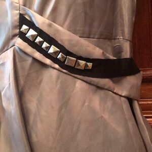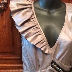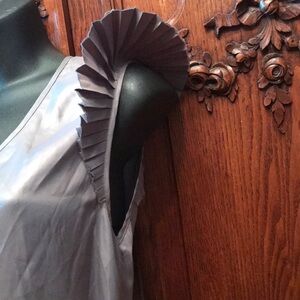Very unique sleeveless top from Pencey. Silver tone shiny material with a raw edge hem, studded sash & a ruffled & pleated embellishments at the sleeves. Excellent condition. Size 2.
