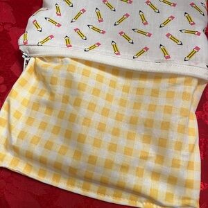 Adorable kids featuring a playful pencil pattern. Perfect for storing small accessories. Bright pink and yellow design adds a fun touch.