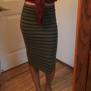 Green and black pencil skirt. Very cute and comfy. You can wear it with a tee tied up, just to head out, or pair it with a nice blouse for work. This skirt is size S but I'm size M and it fits PERFECT. It's very stretchy so will fit both sizes.