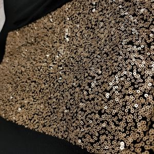 Knit skirt with a panel of bronze sequins centered on the front of the skirt. Rayon / Polyester / Spandex
