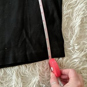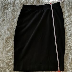 Perfect for the office! Black pencil skirt, form fitting, approx 20 inches long, stretchy fabric very forgiving. Well loved from pet and smoke free home.