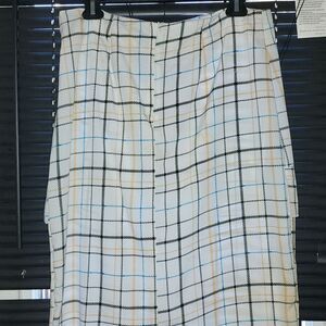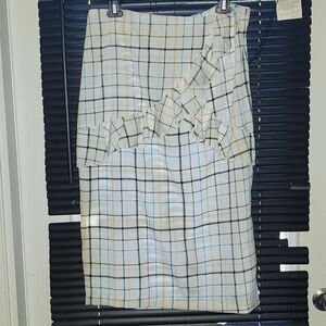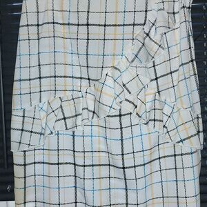 unique broken plaid design with ruffle detail rear zipper and split
