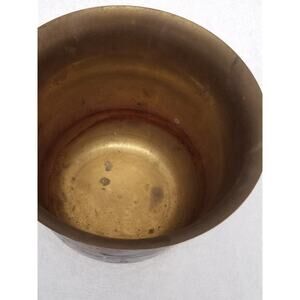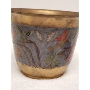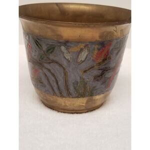 The product is a brass bowl with blue inlay featuring parrots, manufactured by Penco Industries Inc in India. It is adorned with intricate details showcasing traditional craftsmanship. This pot does need to be cleaned with some brass cleaner.