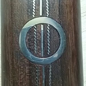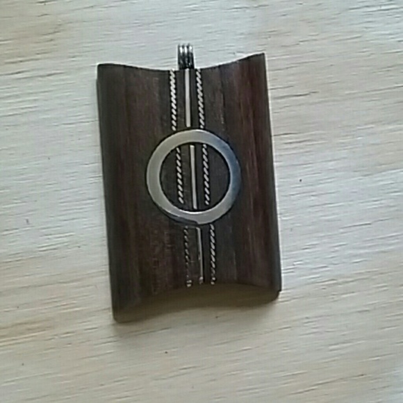 A lovely stained mango wood pendant inlaid by hand with silver plated metal. It's about an inch and a half long and one inch wide. A beautiful earthy-chic statement piece.