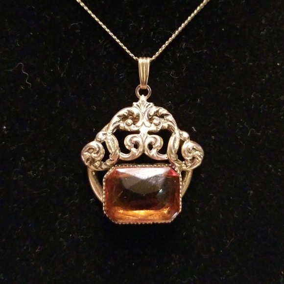 Vintage Amber colored stone in gold tone setting. Some gold tone fading on back side.