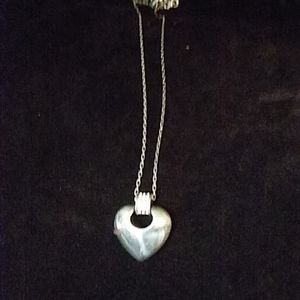Solid heart shaped pendant with enlayed design on back & cut crystal stones on front.