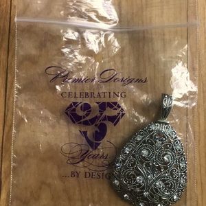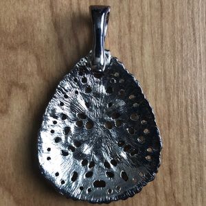 Silver Tear drop pendant with crystals throughout the piece. It has a clasp clamp that will allow you to accessorize any chain, tie, scarf or head wrap.