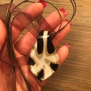 Very pretty back, cream and gold pendant necklace, which hangs from and intertwined string of Burgundy and black. This necklace has an adjustable link closure.
