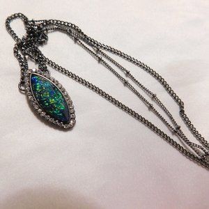 Pretty pre-owned Pendant Necklace Blue/Green Stone Double Strand. Depending on how the light hits it, colors are shades of speckled green/blue with rhinestones around it. In overall good pre-owned condition - the pendant is approx. 1" x 1/4. Necklace unclasped approx. 20 1/2" long
