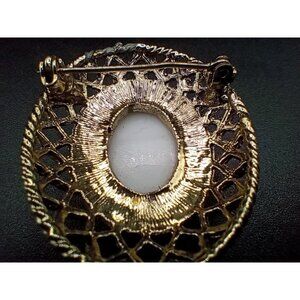 Please see photos for condition issues, I try to list anything I see here as well and feel free to send me a message with any questions. A minor scuff on the brooch pin. Chain is intact. Back of brooch pin has slight bend to it.