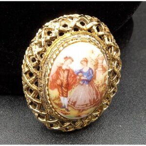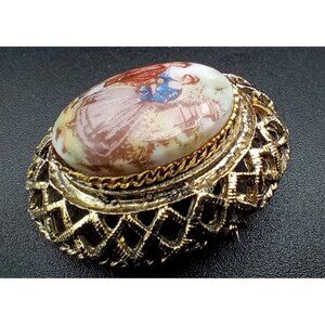 This exquisite vintage set has a pendant necklace and brooch with an enchanting courting scene. The gold-tone chain complements the intricate German craftsmanship, making it perfect for adding timeless elegance to any outfit.
