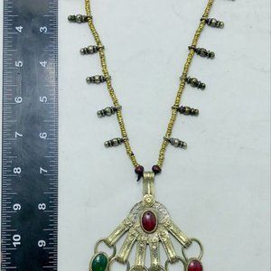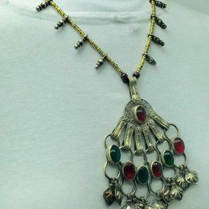Pendant Necklace, Tribal Big Pendant With Red and Green Glass Stones and Beaded