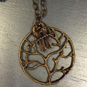 Vintage gold chain with branch medallion, bird charm and birdcage charm