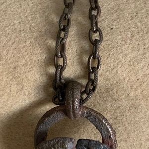 This pendant is made from an arrow head and what I believe is jade. It is beautifully handcrafted. It is brand new. I purchased it at a craft fair for my husband. He didn’t care for it. It can be worn by both men and women, but it’s a bit heavy for a petite person. The chain is 22” and extends to 24”. It’s a dark coppery bronze in color.