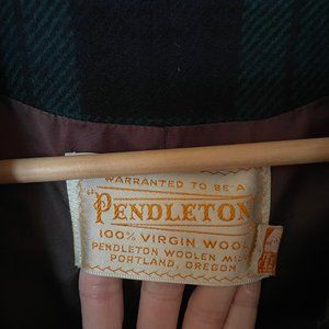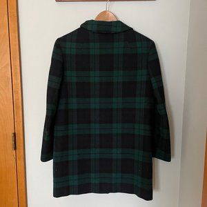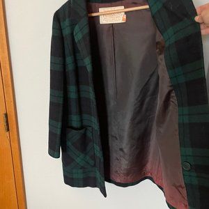 Amazing vintage green and navy plaid jacket. I dont see a size tag, but Im a size 4 and wore this as a little oversized jacket.