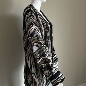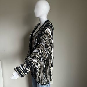 COOGI *Style Vintage 90’s Cardigan By Giorgio Di Firenze, This Funky V~Neck Cardigan Sweater Has The Recognizable 3-D Texture Pattern Featuring Black, Beige, Ivory, Grey Throughout, Tortoise Shell Buttons, This Is A Men’s Size (XL) But It’s Totally Unisex, I Love It On A Female Worn Oversized As Pictured, Excellent Condition, Dry Clean Only, Measurements Taken Flat, Pit~Pit 25”, Length 30”