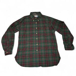 Men’s size L long-sleeve button-down in the Authentic Sinclair Hunting Tartan—a deep green plaid with red/white accents. 100% pure virgin wool, made in the USA. Button-down collar, classic fit. Warm, substantial flannel-weight wool great for fall/winter and outdoor wear.