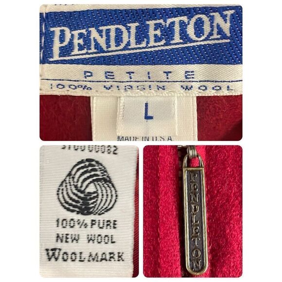 Additional Details: Fully functional front button close slip style pockets, fully lined, shoulder pads sewn in under lining, ribbed knit cuffed sleeves, brass tone hardware, Pendleton logo on the zipper pull.