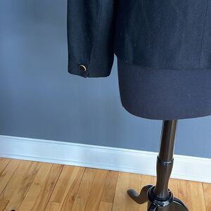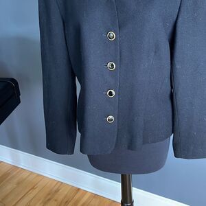 Vintage Pendleton 100% virgin wool lined collarless curved neckline button front jacket. Single button cuff. Shoulder pads. Center back seam. Size 12. Excellent condition. Nonsmoking home.