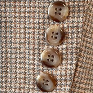 Beautiful, classic 100% virgin wool Pendleton blazer / jacket (vintage/vtg?) in tan/brown/neutrals houndstooth pattern. Women's plus size 14 petite / 14p. Contrasting notch-style lapels in tan polyester. Fully lined in brown. 2-button front closure. 4-button wrist. Two flap pockets with contrast trim. Gorgeous, timeless design. Great for work, party, going out, meetings, travel, fall, winter. Looks great buttoned or open, casual or dressy.