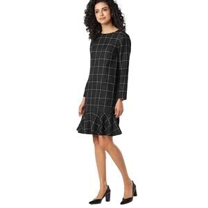 This luxurious wool dress by Pendleton is 100% virgin wool (soft texture). Lightweight, Black with white windowpane pattern. Long sleeves, high neckline, flounce ruffle hem, and two front pockets. Lined.